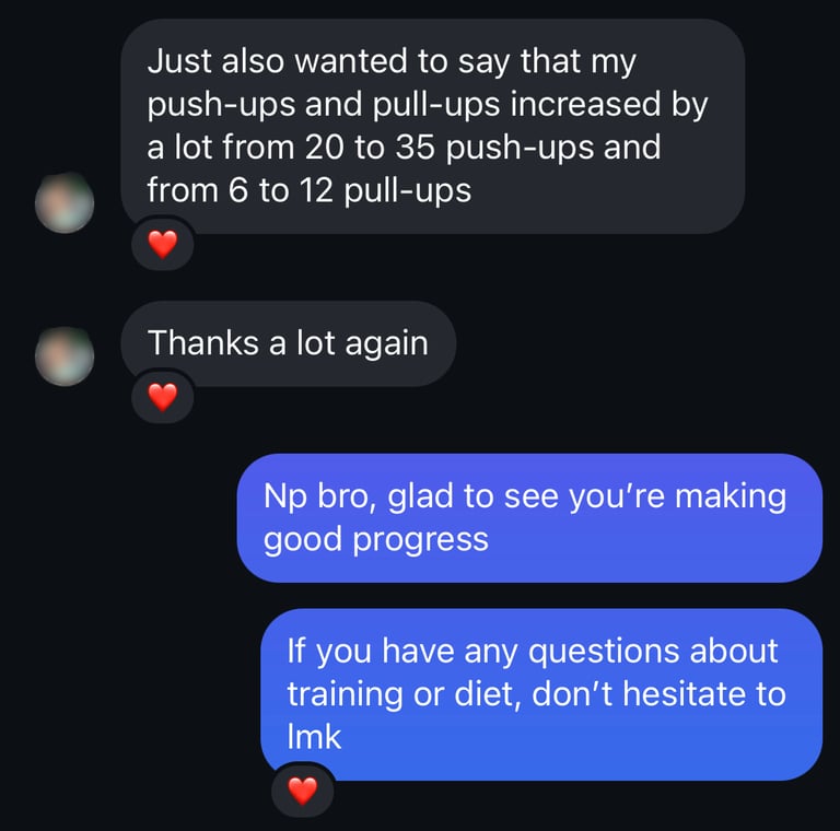 Isak got my training plan hoping to completely transform his strength and physique. Only 1 month in, he has already gained 2 kg, built noticeable muscle, and went from no muscle up to 2 reps.